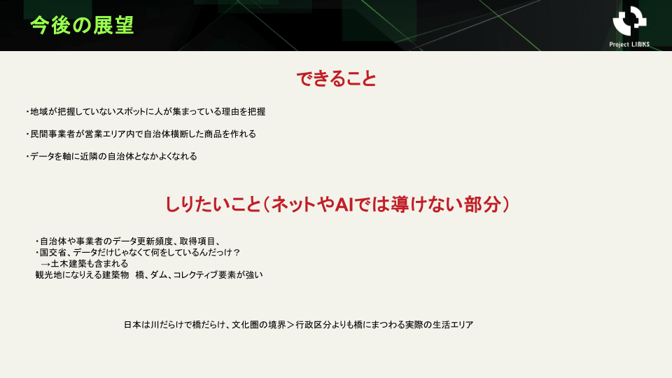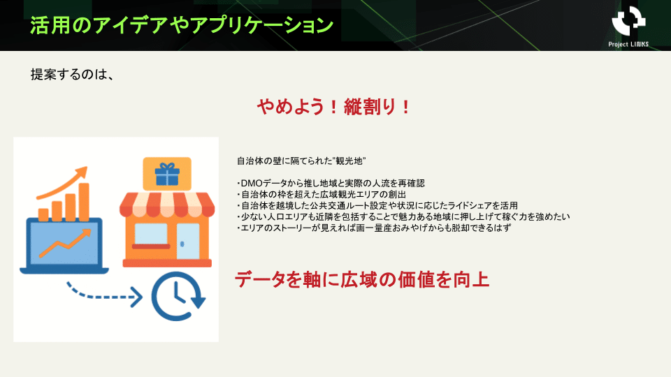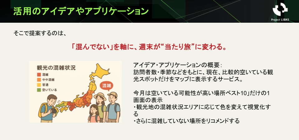 そのために、同チームはLINKSの観光関連データ、公共ライドシェア・バス・タクシーの移動手段データに、フリーWi-Fiのデータから取得する実際の人流データを組み合わせて、広域観光エリアを創出するための新たなオープンデータを作るアイデアを打ち出した。観光客が自治体をまたいでどのように移動しているか、自治体が把握していないスポットに人が集まっているのはなぜか、データから広域観光エリアの構想がみえてくる。