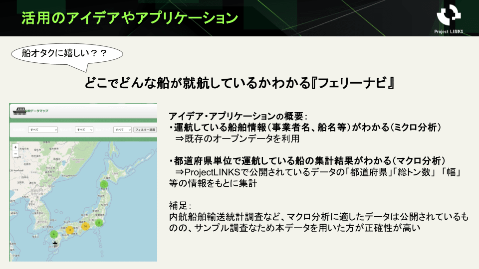 チーム・フェリーナビのメンバーは、LINKSの一般旅客定期航路事業データ、および内航海運業データを活用し、いつ・どこで・どのような船が就航しているかを可視化するアプリケーション「フェリーナビ」のアイデアを発表した。