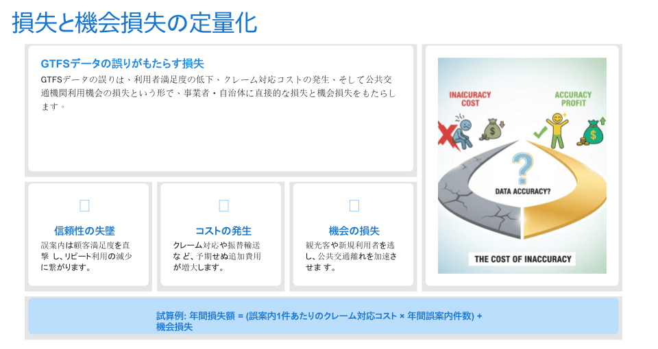 チーム・GTFSデータ探偵団は、GTFS(交通関連情報)のバス路線情報の誤りを迅速に修正するためのアイデアを発表した。現在、GTFSのバス時刻表や路線情報のデータの誤りは、利用者からの偶発的な報告や監査によって発見されている。そのため、誤りの検知や修正には時間がかかるケースが多い。