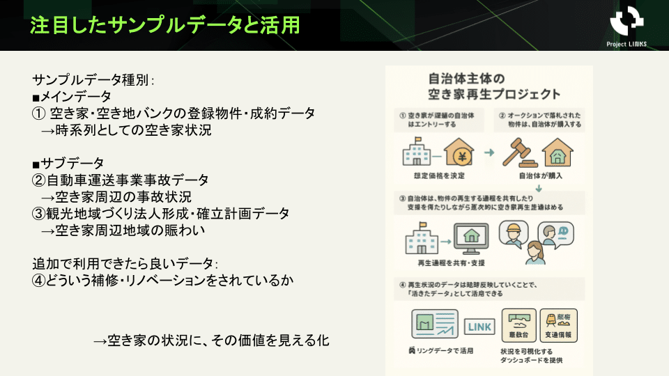 チーム・投げ銭空き家は、「LINKSデータで進む・見える『空き家』再生」と題し、空き家の活用を促進するプロジェクトのアイデアを発表した。
