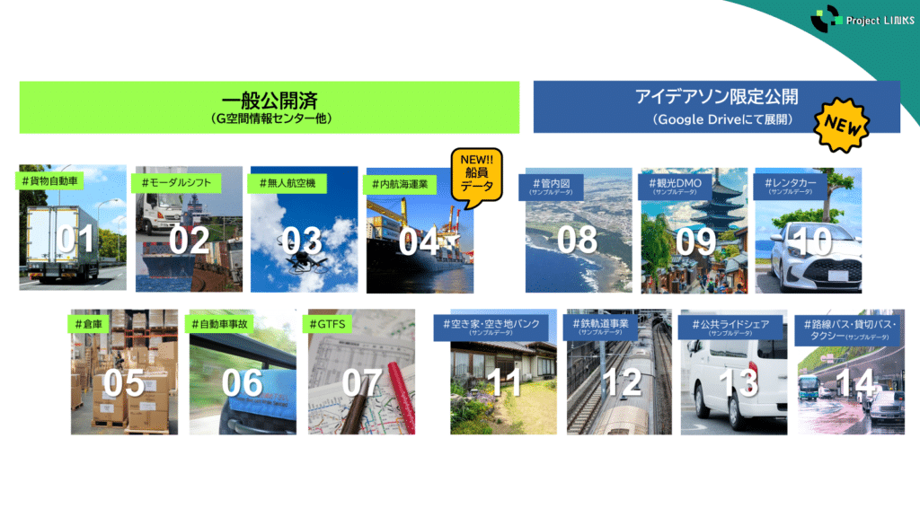 10月25日には、一連のイベントの第2弾となるアイデアソンがオンラインで開催された。LINKSのオープンデータを使って、社会課題や身近な困りごとを解決するアイデアをチームで競う。今回は、G空間情報センターで公開済みの「貨物自動車」「モーダルシフト」「無人航空機」「内航海運」「倉庫」「自動車事故」に関連するデータ、「GTFS(交通関連情報)」関連データに加えて、アイデアソン限定で以下のサンプルデータが用意された。