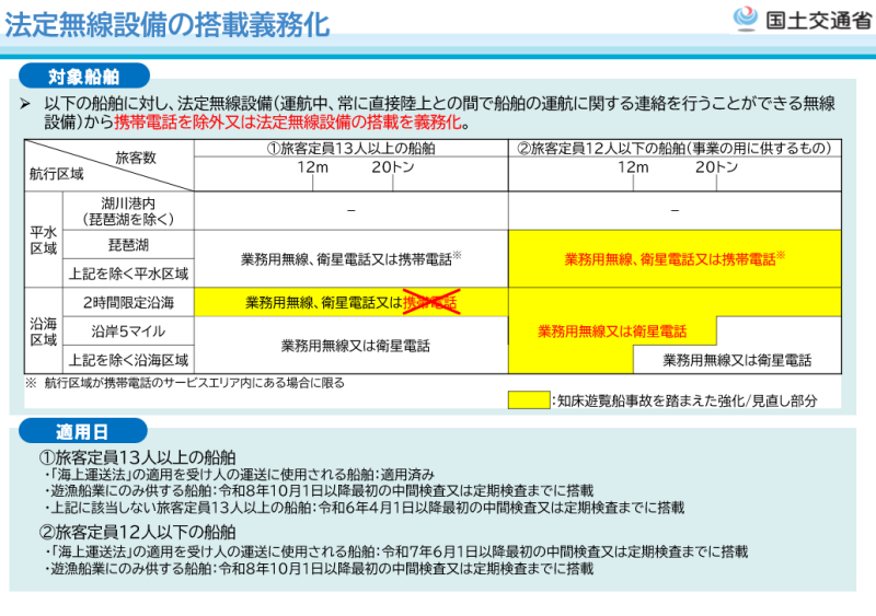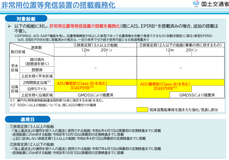 注)船舶個別の事情によらない、安全設備等の義務化に関する制度全般については、国土交通省へお問い合わせください。