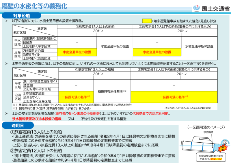令和4年4月23日に発生した知床遊覧船事故を受け、「知床遊覧船事故対策検討委員会」や「知床遊覧船事故を踏まえた遊漁船の安全設備の在り方に関する検討会」において、一般旅客を搭載する船舶への安全設備等の義務化に向けた検討を進めてまいりました。
