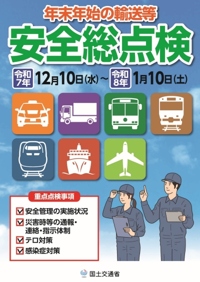 国土交通省では、旅客等の輸送が増加する年末年始に、「年末年始の輸送等に関する安全総点検」を全国で実施します。