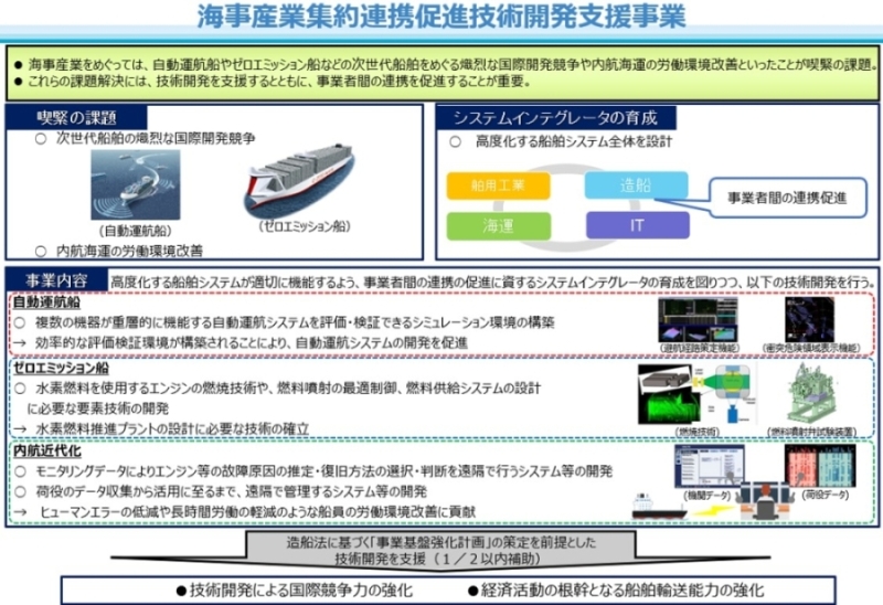 国土交通省では、技術のトップランナーを中核とした海事産業の集約・連携強化を図るための技術開発支援事業を実施しています。