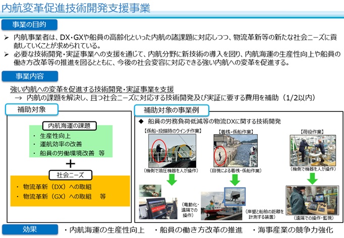 また、本事業によって開発・実証された新技術を広く内航分野に横展開することにより、内航海運の生産性向上や船員の働き方改革等の推進を図るとともに、今後の社会変容に対応できる強い内航への変革を促進します。