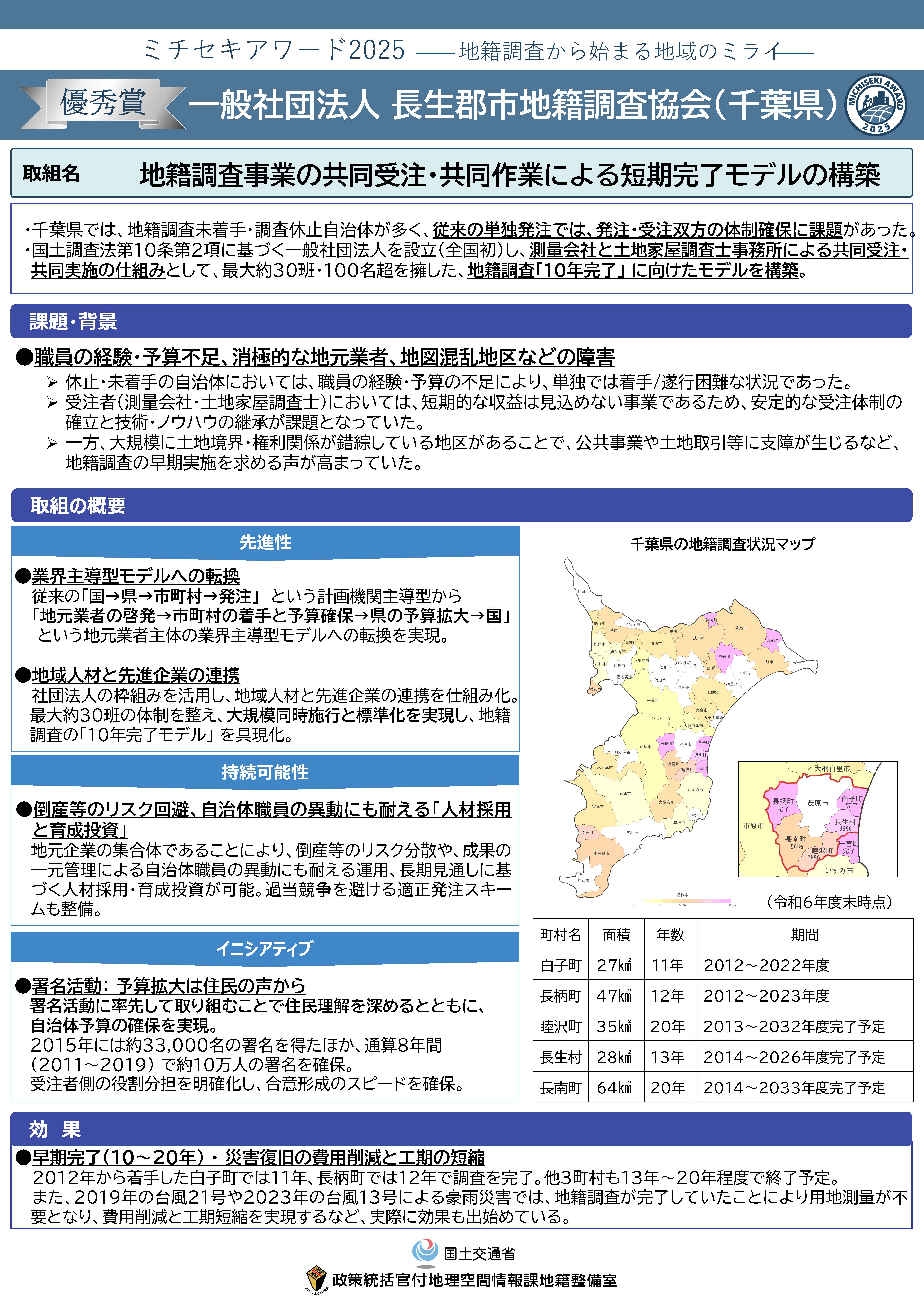 ボトムアップ型で地域住民への意識啓発に取り組んだのみならず、受注体制の安定的な確保にもつながる仕組みとして構築されており、今後の短期集中的な地籍調査の遂行に示唆を与える優良事例として高く評価された。