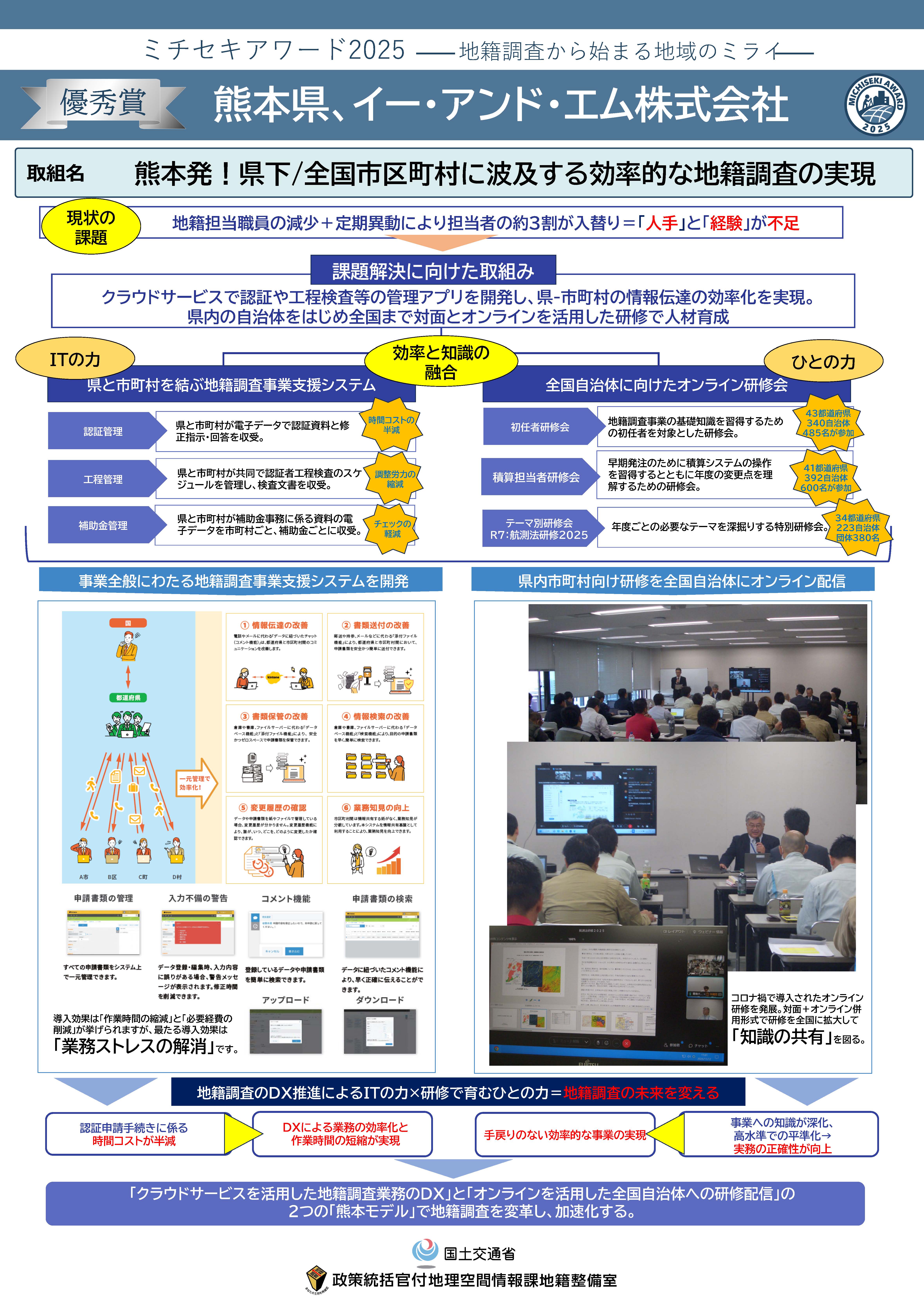 また、県が民間事業者と連携して認証管理アプリを開発し、市町村と県との間で、情報共有や申請手続きの合理化を図り、県・市町村・現場の事業者それぞれメリットがある「三方よし」のモデルとして構築した。効率化による成果も明確であり、研修の全国展開を含め、他県への展開可能性が高く、県が主体的となって効率的な地籍調査の推進に取り組む、都道府県の一つの役割を示した点が高く評価された。