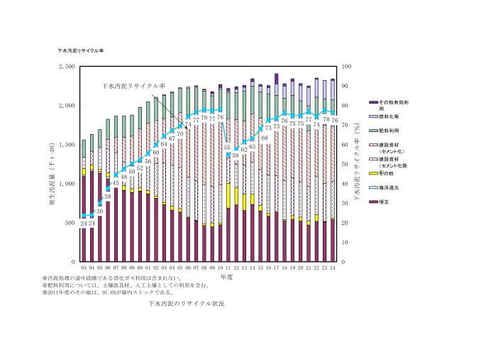 - 下水汚泥のマテリアル利用は2011年度(平成23年度)以降は東日本大震災の影響により埋立処分や場内ストックが増えたため、利用が減少したが、2012年度(平成24年度)以降再び上昇に転じている。