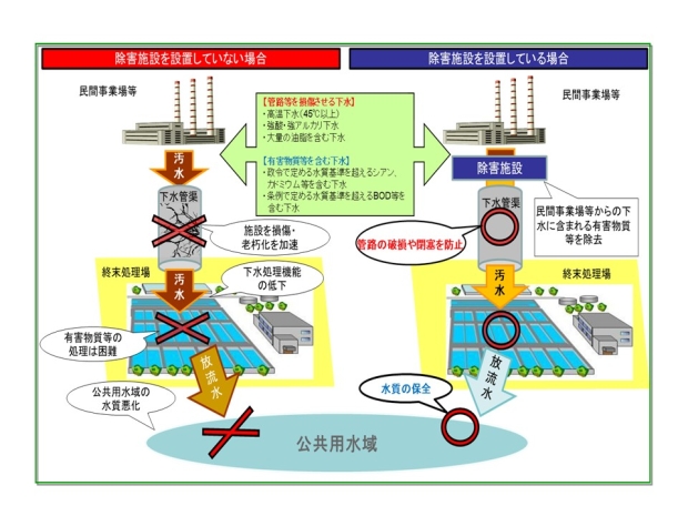 下水道法や条例で除害施設設置が義務付けられた事業場等から排出される下水については、除害施設を設置することにより処理され、下水管へ流入します。