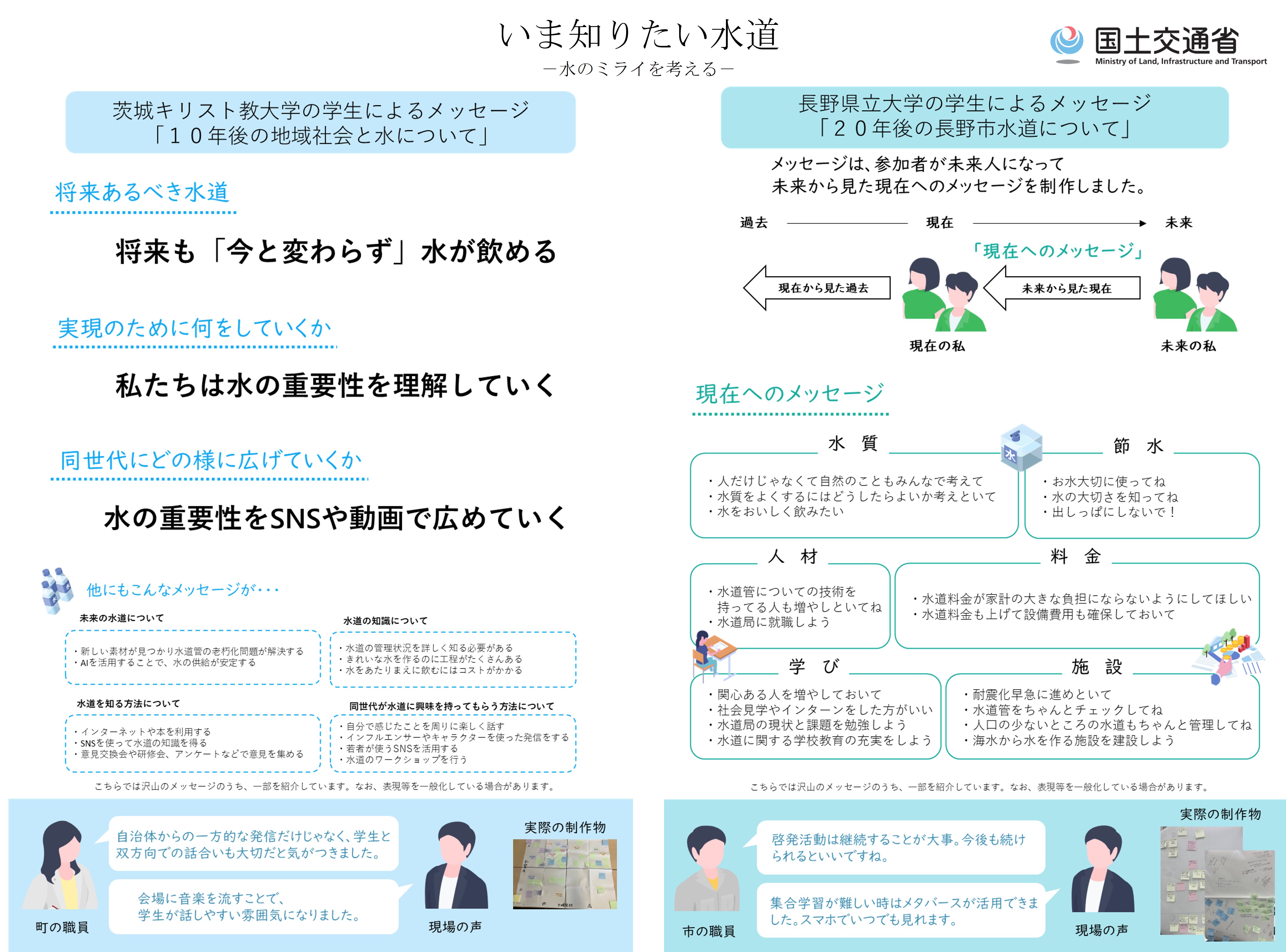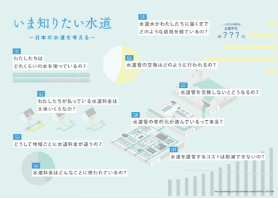 水道事業には施設の老朽化や管路の耐震化、人口減少など、実は大きな課題が隠れています。令和6年度では、このような課題に向き合うために、地域住民が水道事業者と水道の現状を学び、みんなで話し合いながら水道の未来について考え、「いま知りたい水道 水のミライを考える」を作成しました。