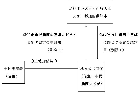 地方公共団体は、その設置する市民農園で、局長通達別紙1の記の1(1)〜(7)の要件に該当するものについては、特定市民農園の認定の申請書を市町村(政令指定都市を除く。以下同じ。)にあっては当該市町村の存する都道府県の知事に、都道府県又は政令指定都市にあっては農林水産大臣及び建設大臣に提出の上、特定市民農園の認定を受けることができる。特定市民農園の認定は認定書の交付によることとし、認定の申請書及び認定書の様式は、別添1によるものとすること。