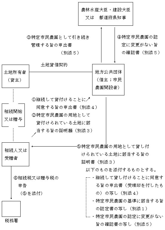 (5) 特定市民農園の用地として貸し付けられた土地の相続人等は、相続税又は贈与税の申告に際し、(4)の証明書を所管税務署長に提出するものとする。