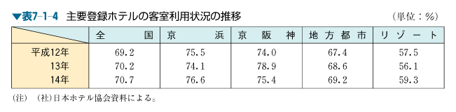 なお,主要登録ホテルにおける客室利用状況は,表7-1-4のとおりとなっている。14年と13年を比較すると京浜地区は2.5%の増,京阪神地区は3.5%の減,地方都市は0.6%の増,リゾート地区は3.2%の増で,全国では0.5%の増となっている。