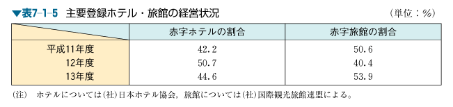 経営状況については,表7-1-5のとおりとなっている。13年度と前年度を比較すると,赤字ホテルの割合は50.7%から44.6%へ減少,赤字旅館の割合は40.4%から53.9%へ増加している。