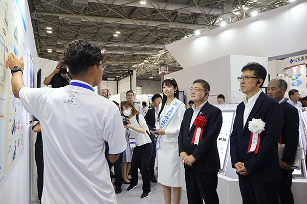 古川副大臣は「ご来場の多くの皆様に下水道への関心を深めていただくとともに、展示されている最新技術が全国に普及・展開していくことを期待しています。『下水道展’25大阪』が実りあるものとなることを心より祈念いたします」と挨拶するとともに、展示場の内覧を行いました。