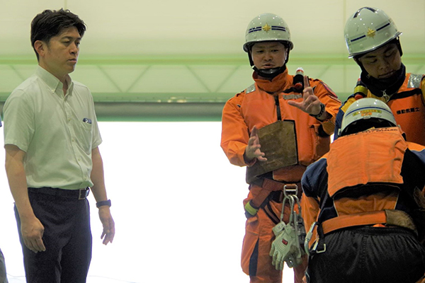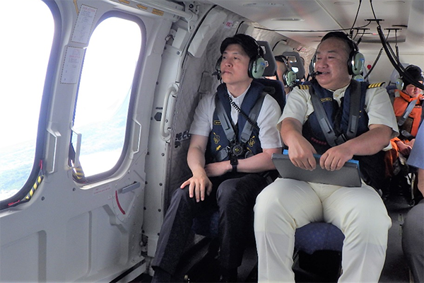 鹿児島航空基地七ツ島運航支援センターにおいては、基地所属の回転翼航空機に搭乗し、錦江湾を上空から視察するとともに、機動救難士によるリペリング降下訓練を視察しました。