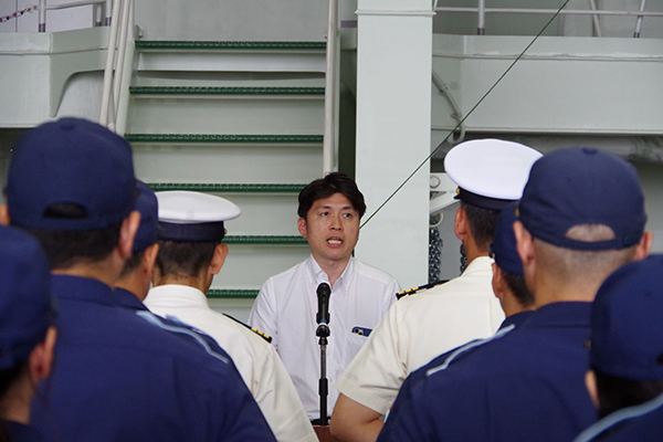 中野大臣は、職員に対し「皆さんが誇りをもって業務に精励する姿を目にし、大変感銘を受けました。引き続き、大達本部長のもと管区一丸となって任務を果たされることを期待しています。」と激励しました。