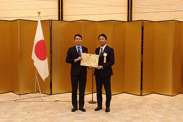 德重代表取締役(左)に表彰状を授与した𠮷井政務官(右)