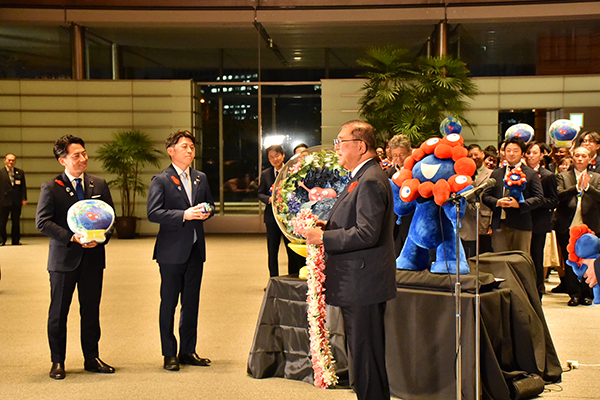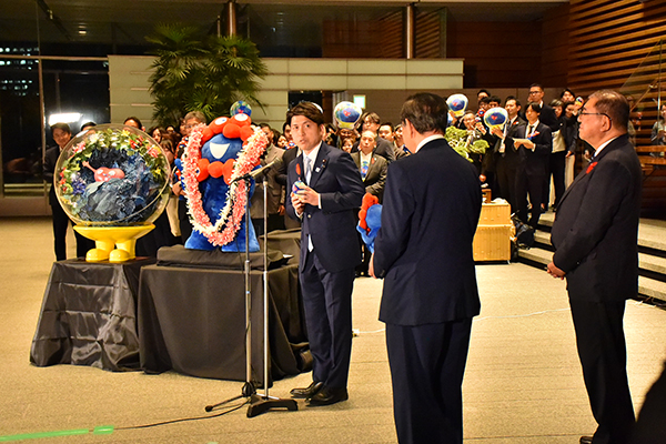 離任式で、石破総理は伊東万博担当大臣及び万博関係職員への慰労、ミャクミャクへの感謝を述べられた後、園芸博への思いを込め、ミャクミャクにレイを贈呈されました。