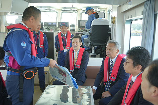 港湾業務艇で茨城港常陸那珂港区の説明を受ける高橋副大臣