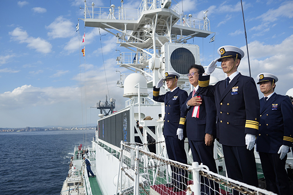 11月8日(土)、金子大臣は巡視船あさなぎに乗船し、鹿児島港沖合で行われたJCGクルーズ2025(主催:第十管区海上保安本部)に出席しました。