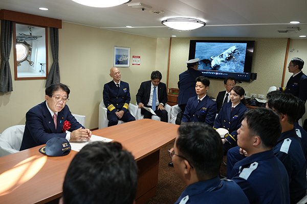 また、海上保安庁若手職員と懇談し激励したほか、巡視船あさなぎに乗船された方々に「本日の訓練、そして海上保安官との触れ合いが、海上保安庁の活動に対する理解を深めていただく一助となれば幸いです」と挨拶しました。