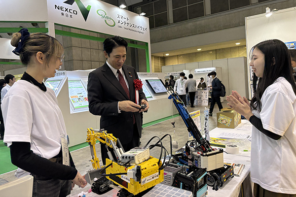 高専生によるインフラを守る方法などの革新的なアイデア作品を展示するブースでは、高専生から作品の説明を受けました。