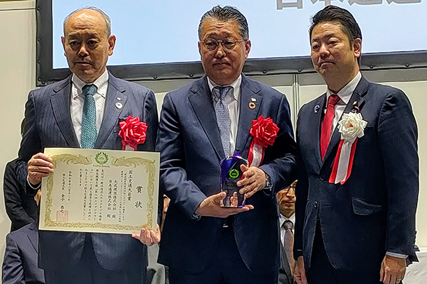 式典では、「建設副産物巡回回収システム」の構築による建材サーキュラーエコノミーの実現に向けた取組(大成建設株式会社及び日本通運株式会社)が国土交通大臣賞受賞され、永井政務官から表彰状及び表彰盾が授与されました。
