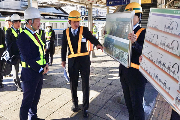 春日部駅では、春日部駅周辺のまちづくりの変遷や東武鉄道春日部駅付近連続立体交差事業の概要と整備効果等の説明を受け、春日部駅の工事状況を視察しました。