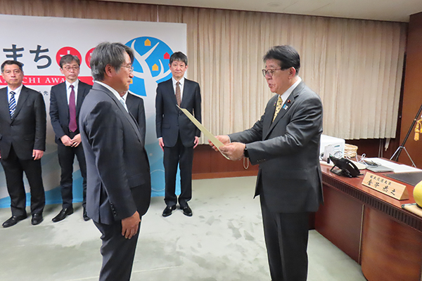 砂川市長に授与する金子大臣