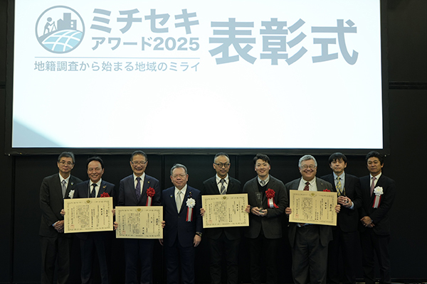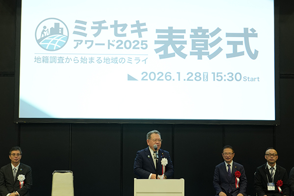 1月28日(水)、酒井副大臣は、「G空間EXPO(会場:東京ビッグサイト)」において行われた「ミチセキアワード2025 ~地籍調査から始まる地域のミライ~」表彰式に出席し、大賞として決定した「地籍調査は社会のインフラ ~まったなし、地籍調査~」(三重県津市)のほか、優秀賞3件を表彰しました。