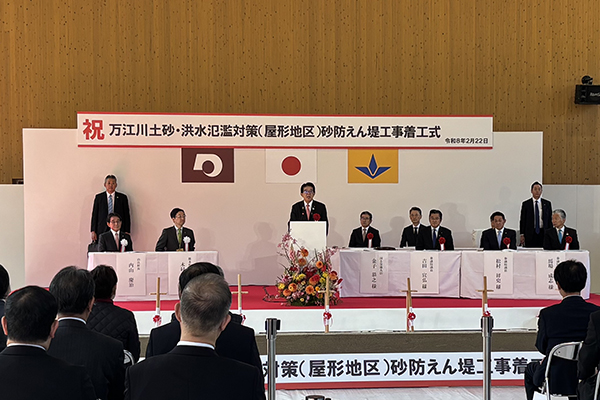 金子大臣は、祝辞にて、土砂・洪水氾濫対策として砂防・治山・河川事業が連携し、全国の先進事例となる本事業を、国としてもしっかりと支援していく旨を述べました。