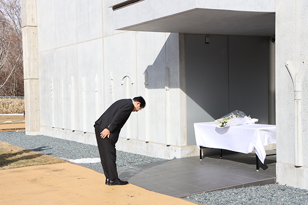 慰霊施設で献花を行った後、伝統的コタンにおいてアイヌの暮らしなどの説明を受けました。