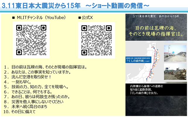 また、震災の大きな犠牲の上に得られた教訓を決して風化させてはなりません。発災15年の節目に、未曾有の大災害の記憶を改めて胸に刻み、復興で得られた教訓や知見を全国各地の防災・減災対策に生かすことが重要です。このたび、震災当時まだ幼かった若い世代の方々にも当時の被害状況や災害伝承の取組などを伝えるため、10本のショート動画を作成し、本日から、