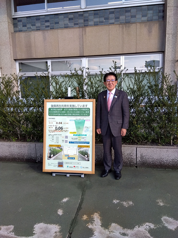 除去土壌が復興再生利用された花壇を視察する金子国土交通大臣