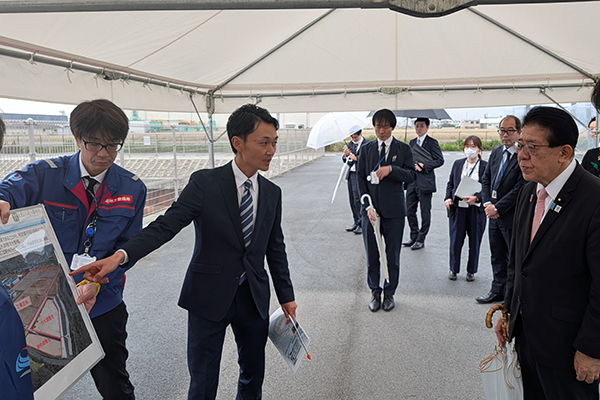 具体的には、大阪府堺市の「大和川高規格堤防」、柏原市の「亀の瀬地区地すべり対策」、奈良県川西町の「大和川保田遊水地」及び「唐院工業団地調整池」を視察しました。