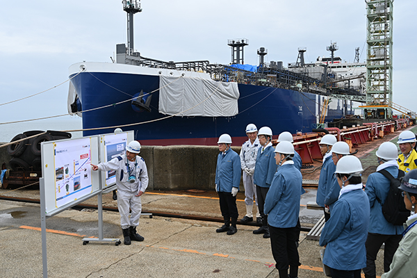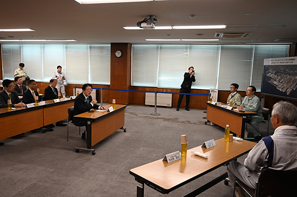 我が国を代表する造船会社である「ジャパンマリンユナイテッド」、日本の海運を長年支えてきた「日本郵船」、日本で唯一の大型エンジンのライセンサーである「ジャパンエンジンコーポレーション」といった造船、海運、舶用等の関係者が一体となって開発に取り組むことで、ユーザーである海運会社の声をダイレクトに反映させ、安全の面でも、使いやすさの面でも、優れた船舶になっていると説明を受けるとともに、建造中の大型アンモニア燃料船、VLCC(超大型原油タンカー)などを視察しました。
