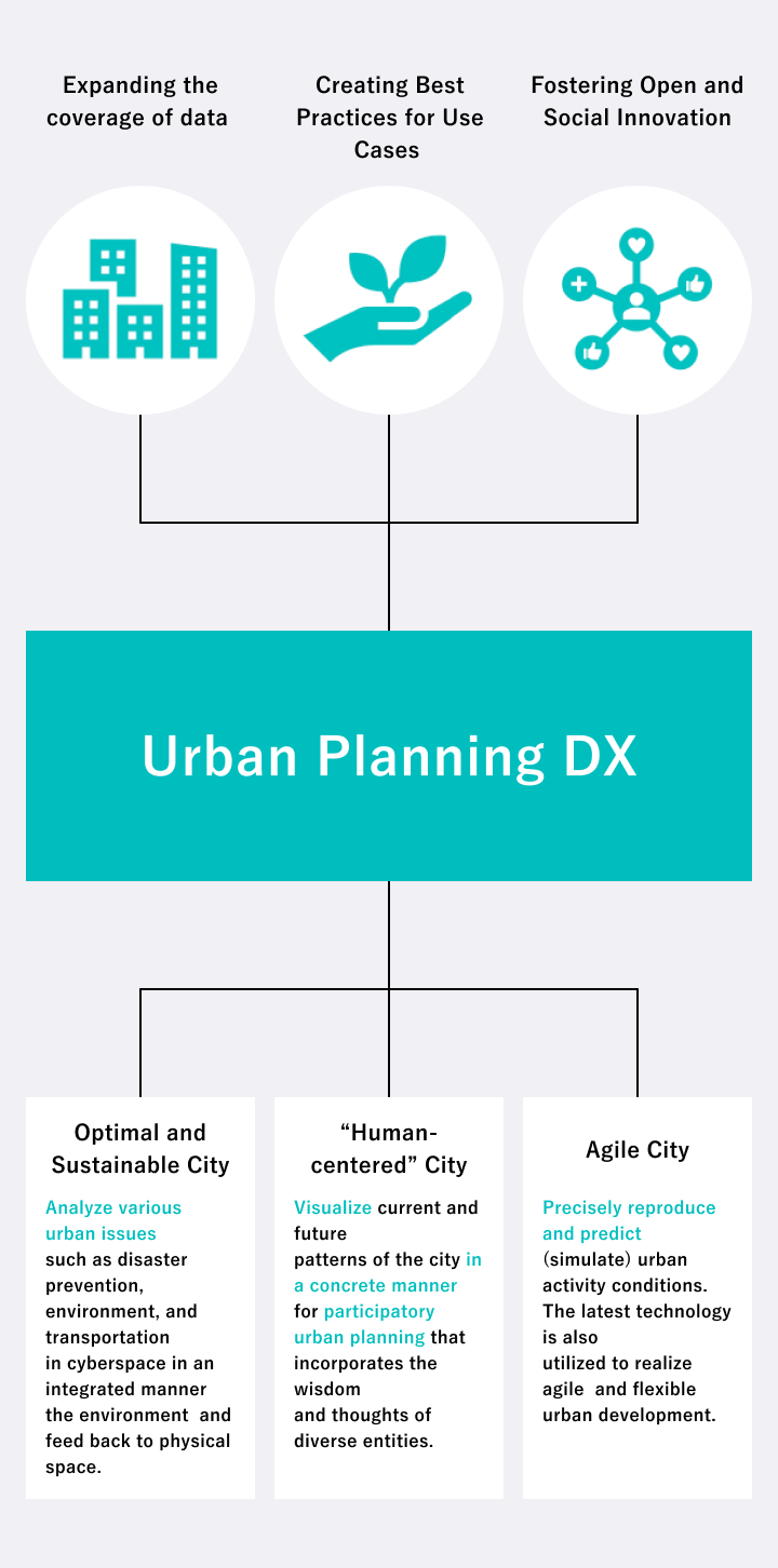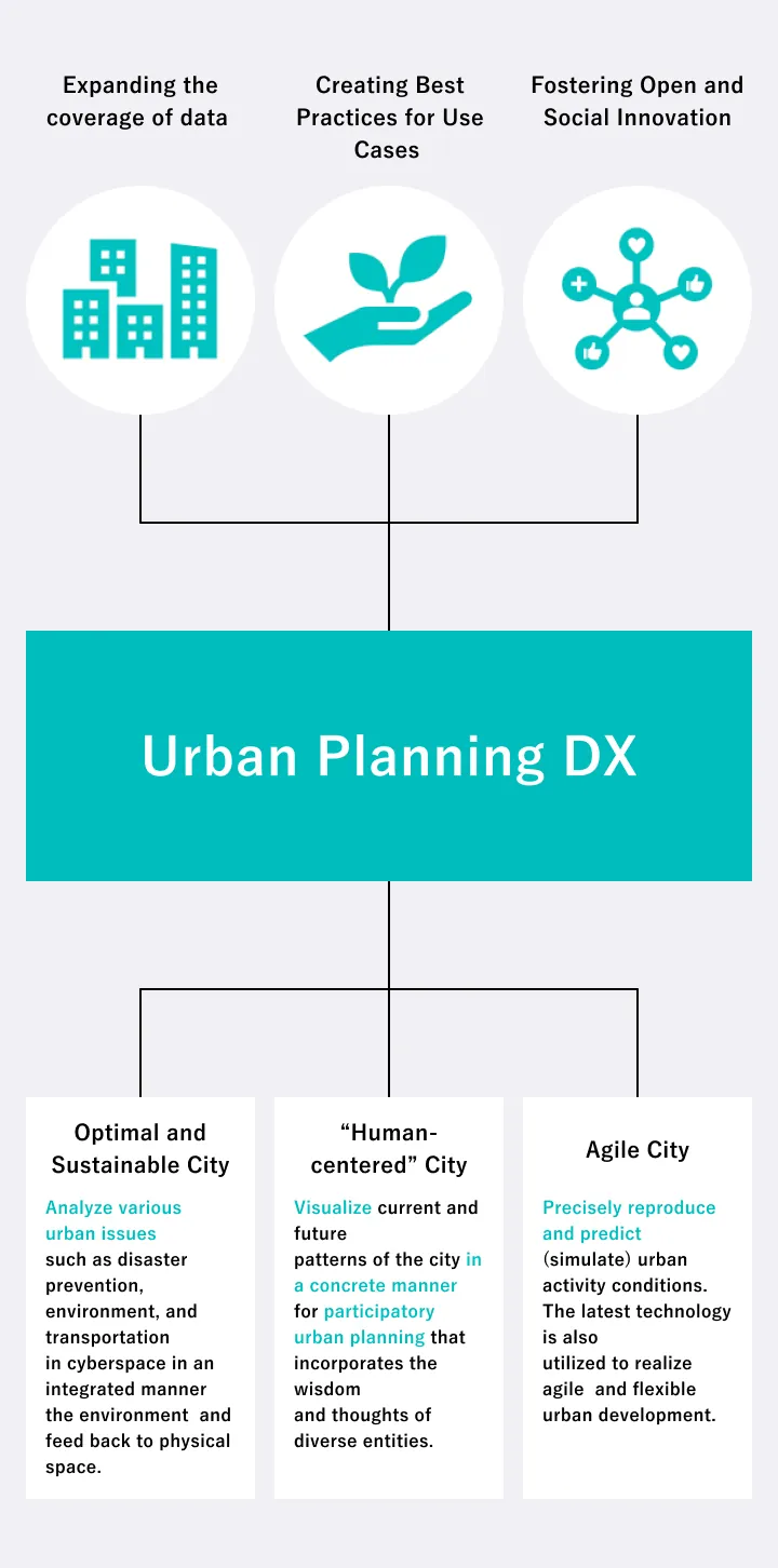 PLATEAU aims to serve as a digital infrastructure for “Digital Transformation in Urban Planning,” which seeks to realize human-centered urban development that supports richer lifestyles and diverse ways of living and working through digital technology.
