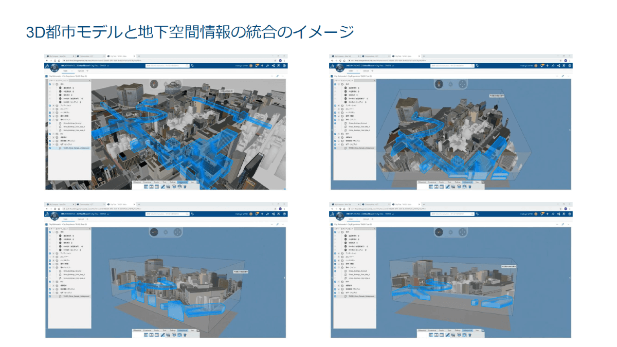 プロトタイプとして提示されたのは、東京・銀座をモデルとした試作例。PLATEAUの3D都市データを用いて、地上の建物や道路と地下構造物を同一プラットフォーム上に表示し、工事計画や維持管理に反映できるようにする。
