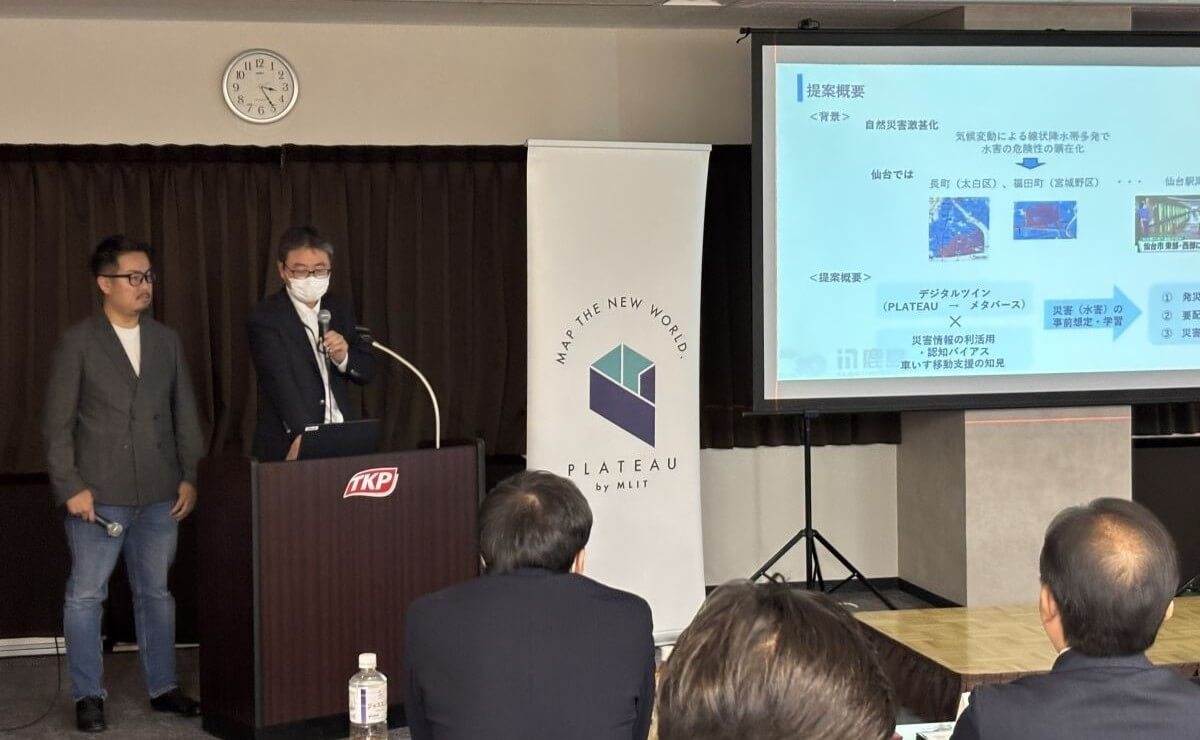 こうした課題に対し、PLATEAUやメタバースを活用したデジタルツイン上で、災害時の状況を事前に体験・学習できる環境を構築する。誰でもアクセスできる3Dのバーチャル都市を用意し、立体的かつ直感的にリスクを理解しながら、住民と行政が双方向で情報を共有・議論できる場を目指す。なお、本提案は「仙台BOSAI-TECH」のプログラムに採択され、仙台市内で実証を検討している。