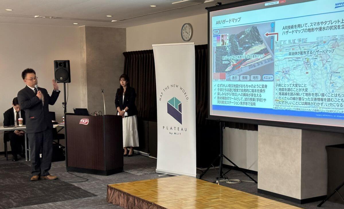 日本工営株式会社のビジュアルコミュニケーションチームは、「3D都市モデルとARでハザードマップを動きのある3Dツールに更新!子どもたちの防災情報への関心づくりに」と題し、防災教育にフォーカスした提案を行った。