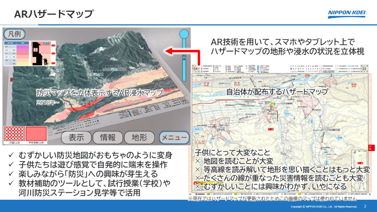 そこで同社が提案したのが、AR技術を用いてハザードマップを立体的に表示する「ARハザードマップ」。平面の防災マップにスマートフォンやタブレットをかざすことで、地形や浸水状況を3Dで可視化し、難解になりがちな防災情報を直感的に理解できるようにするもの。