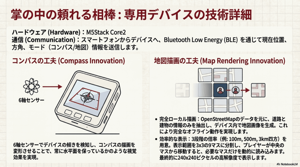 もう一つの特徴が、歩きスマホを前提としない設計。地図や方向の情報をスマートフォンに集約するのではなく、専用デバイスのコンパスを用意。これにより、プレイヤーはスマホ画面に目を落とすのではなく、街並みに目を向けたまま体験を進めることができる。