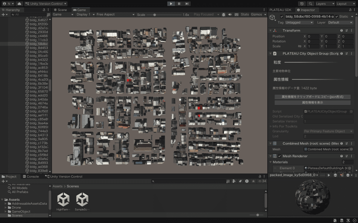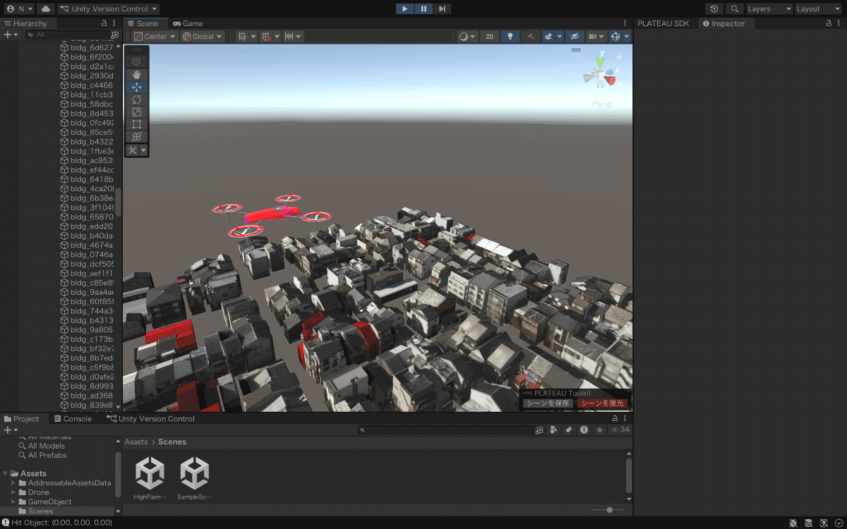 この課題に対し、同チームは消防ドローンという新技術を組み合わせ、PLATEAUの3D都市モデルを活用した火災シミュレーションを開発。Unity上で構築されたシミュレーターでは、建物ごとの構造や条件をもとに、燃えやすさや延焼の広がり方が可視化される。