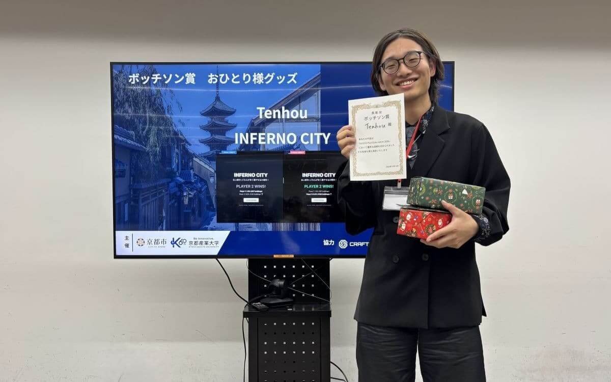 発表では「説教にならない形で、問題を伝えたかった」という意図も語られており、その姿勢がメンター陣の評価につながった。技術面では、UnityとPLATEAU SDK for Unityを用いて京都の街並みを構築。路地の狭さや建物の密集感が、ゲームの緊張感を高める演出として機能している点も印象的だった。