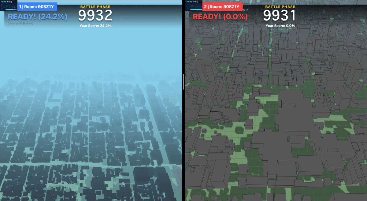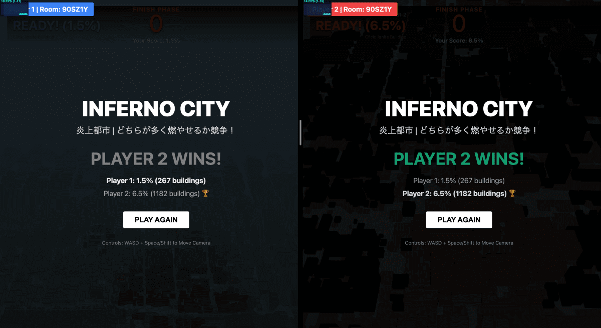 建物間の距離を計算し、延焼範囲を判定、炎の表現や建物の色変化によって、リアルタイムに状況を可視化する。審査員からは、「延焼の広がりを直感的に理解できる可視化」、「Web技術で大規模都市を扱った技術的挑戦」、「『燃やす側』に振り切った設計の潔さ」が評価された。