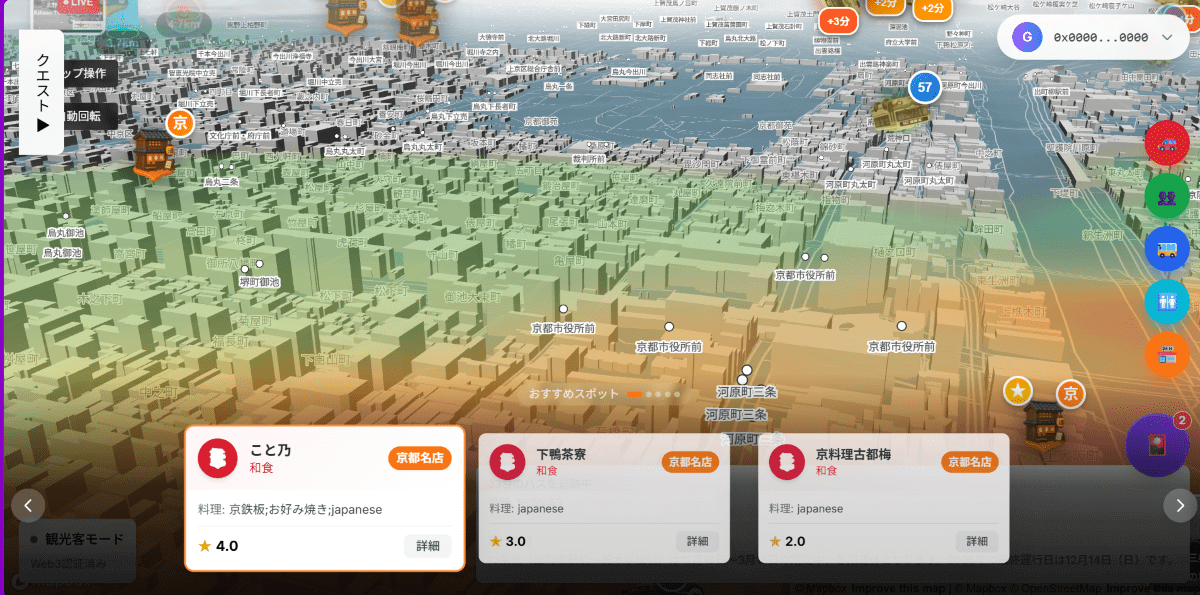 PLATEAUの3D都市モデルをベースに、京都バスのリアルタイム位置情報やエリアごとの混雑度を可視化。さらに、「快適なスポット」を巡ることでデジタルカードを集めるゲーミフィケーション要素を組み込んだ。