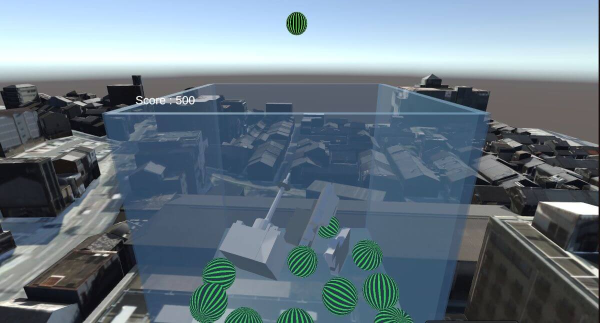 チーム「かかおまめ」が提案したのは、京都の建造物をスイカゲーム風に落とし込んだ3Dゲームで、3D都市モデルの建物の材質データを「くっつきやすさ」に使うなど、遊び心に満ちた発想だった。