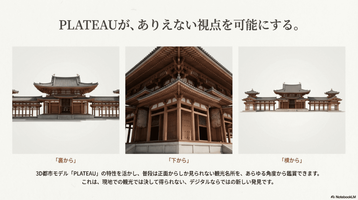 PLATEAUの3D都市モデルは、この体験を支える主役だ。3D都市モデルを「背景」や「地図」として使う作品が多い中で、本作はあえてモデルそのものを観察させる設計を選んだ。上から、横から、裏側から――現実の観光ではなかなか見られない視点で建築を眺められるのも、3D都市モデルならではの価値である。3D都市モデルを活用して、普段は見られない角度から建築を観察させる設計が、文化体験として高く評価された。